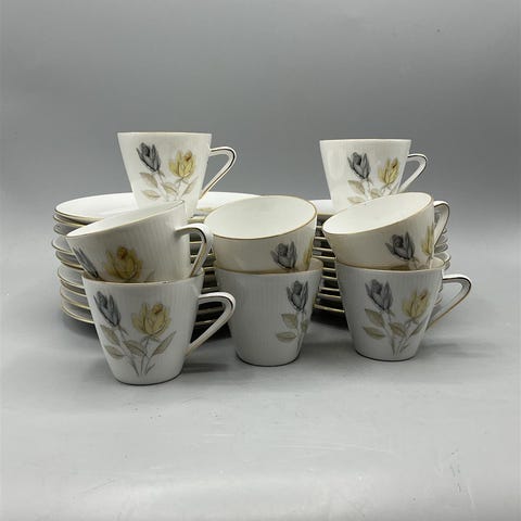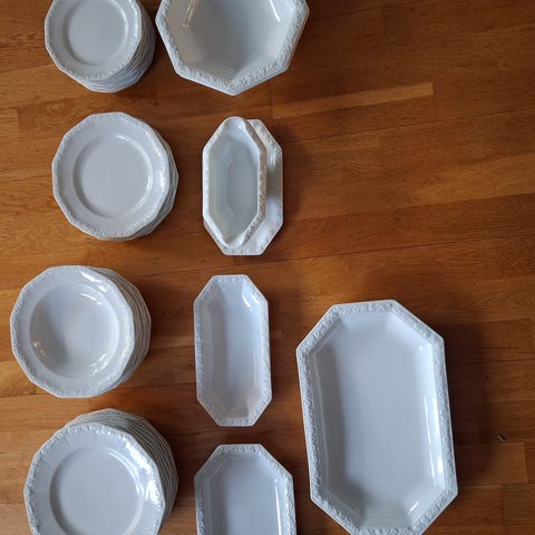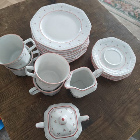 Seltmann Weidenin valmistama astiastosetti, joka sisältää 18kpl lautasia (6kpl matala ruokalautanen, halkaisija 24,5cm. 6kpl Syvä lautanen, halkaisija 21cm. 6kpl lautanen, halkaisija 19cm) kulho, kastikekannu ja 2kpl tarjoiluvati. Astioissa on käsinmaalattu kukkakuviointi ja ne ovat valkoisia.