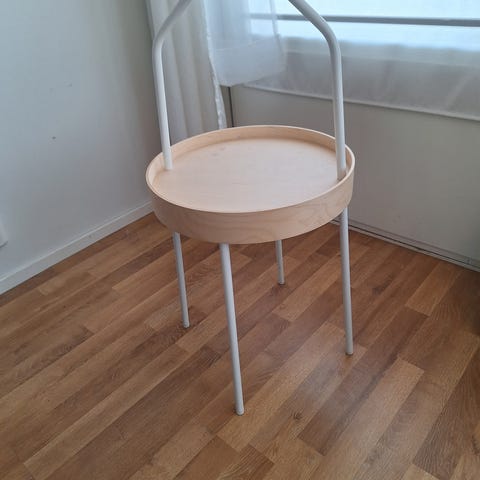 Kevyt musta pieni pöytä. Pöydän kannessa toisella puolella renkula, joka näkyy tietyssä valossa, tullut kosteudesta. Ei haittaa kuitenkaan käyttöä, jos pöydällä on esim. kukka tai pieni pöytäliina.