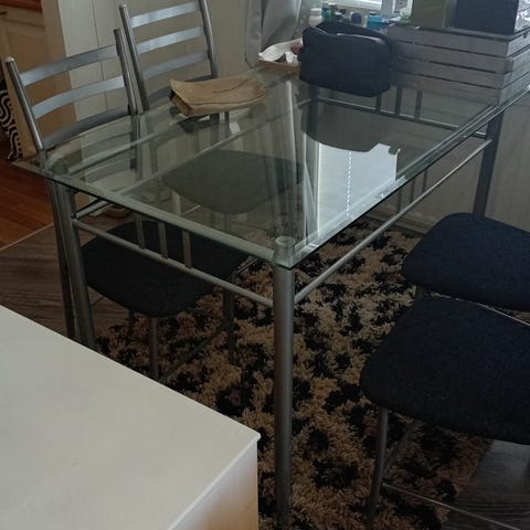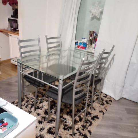Siisti lasikantinen ruokailuryhmä. Kunto hyvä. Muutamia naarmuja lasikannessa.