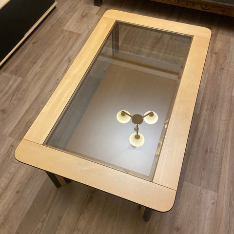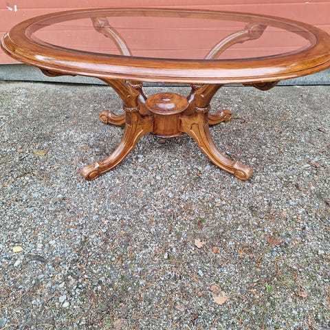 Tämä komea puinen olohuoneenpöytä etsii uutta kotia. Kunto hyvä. Lasi irroitettava ja ehjä. Kaksi syvää vetolaatikkoa toisessa päässä. Rakenne kuin uusi. Pientä käytön jälkeä. Ei hajuja.