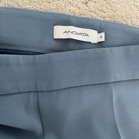 Andiata naisten housut, koko 38. Väri musta ja materiaali satiinimainen kangas. Housuissa on vyötärönauha, vetoketju- ja nappikiinnitys edessä sekä etulaskokset. Suora, levenevä lahjemalli. Sopivat esimerkiksi arki- ja juhlapukeutumiseen.