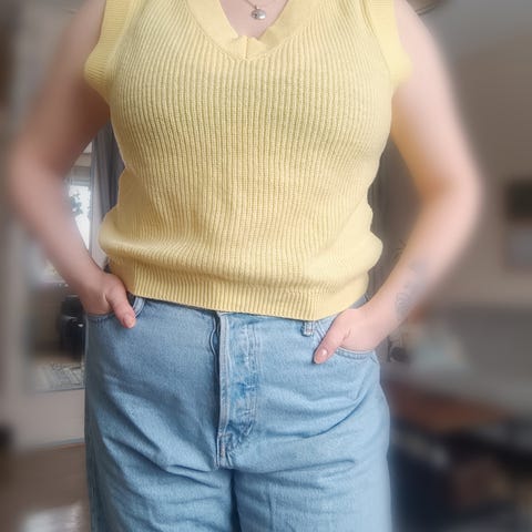 Myynnissä ihanan lämmin ja siistikuntoinen naisten pitkä liivi, koko L. Raikas pastellinkeltainen sävy. Käytetty, mutta erittäin hyvässä kunnossa – valmis uudelle omistajalle.