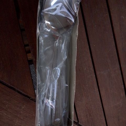 Ruostumattomasta teräksestä valmistetut ruokalusikat, yhteensä 8 kappaletta. Lusikoissa on suora, kulmikas varsi ja soikea pesä. Materiaali on helppohoitoinen ja kestää päivittäistä käyttöä. Pituus 18 cm.
