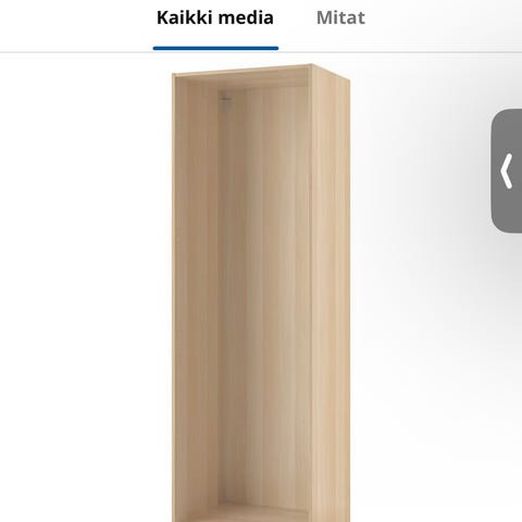 Vaatekaapin runko, vaaleaksi petsattu tammikuvio, 50x58x236 cm. Oli sittenkin väärä koko joten kasattu ja takaseinään leikattu aukko, joka jää seinään vasten niin ei haittaa käyttöä tai hyllyjen kiinnitystä. Ei ollut muuten käytössä. Hinnassa huomioitu reikä ja tästä nyt valmiiksi kasattu runko 45€ (80€ ostohinta) Nouto.