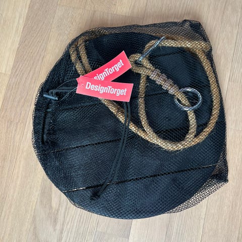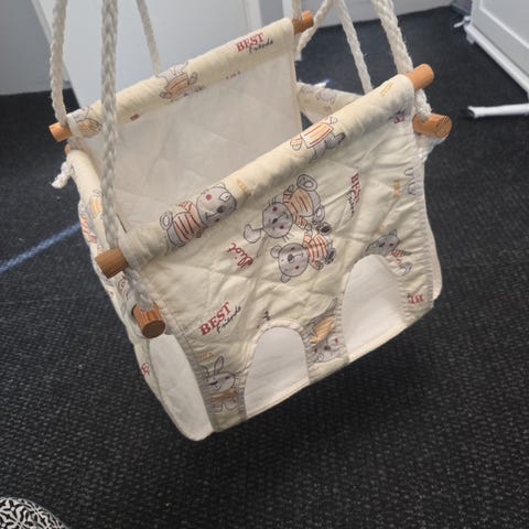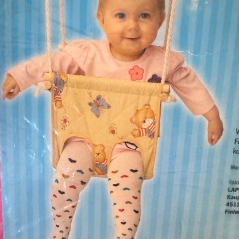 Keinu sisäkäyttöön. Painoraja 18kg. Päällinen konepestävä. Etuosan kapulan kohdalla hieman kellastumaa kankaassa. Kotimainen tuote. Mitat noin 25×25 cm. Pituutta narujen kera kaikkiaan noin 110.