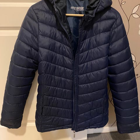 Tummansininen naisten tiskattu kevyt toppatakki.