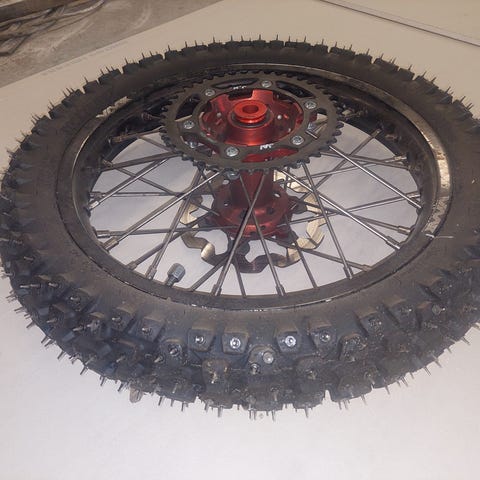 Käytännössä uusi Duro 4.10x18 nastarengas. Ajettu ehkä 3 kertaa (max 100km). Ei soveltunut minun käyttöön, ehkä toimii kaupungissa/kovalla tiellä paremmin.
