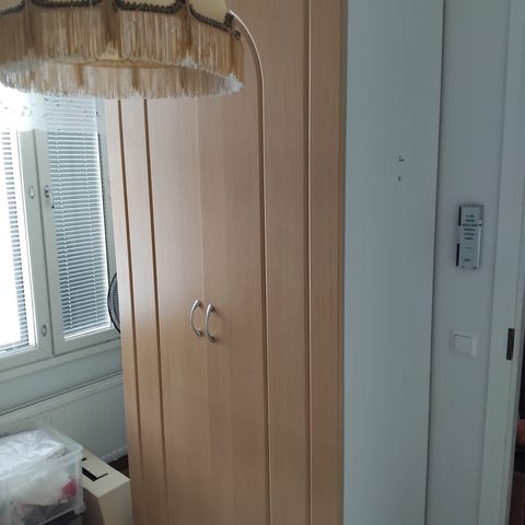 Annetaan purettu vaatekaappi. Kaksi ovea. Toinen hengareille ja toisella puolella 5 hyllyä. Vain nouto.