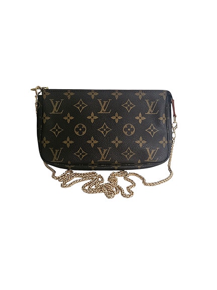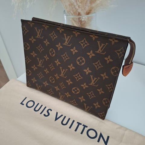 Louis Vuitton Toiletry Pouch 19 muutettu laukuksi asentamalla silmuruuvit, joten sitä voi nyt käyttää olkalaukkuna tai crossbodyna. Voidaan käyttää myös meikkipussukana. Mukana tulee pitkä merkitön (ei LV) kullanvärinen ketju.