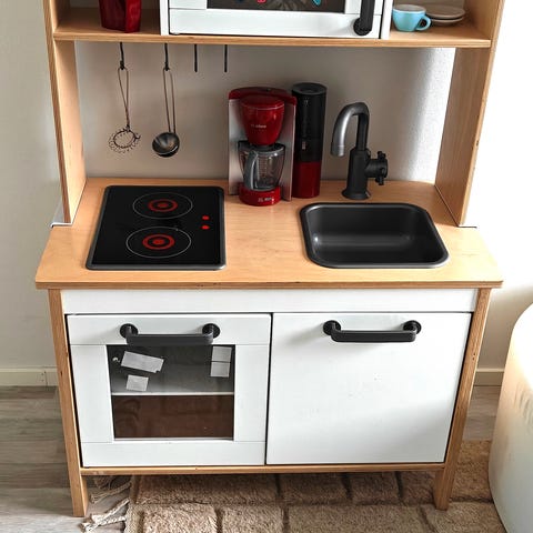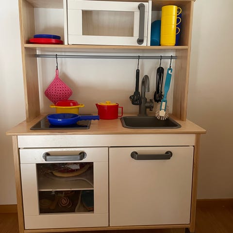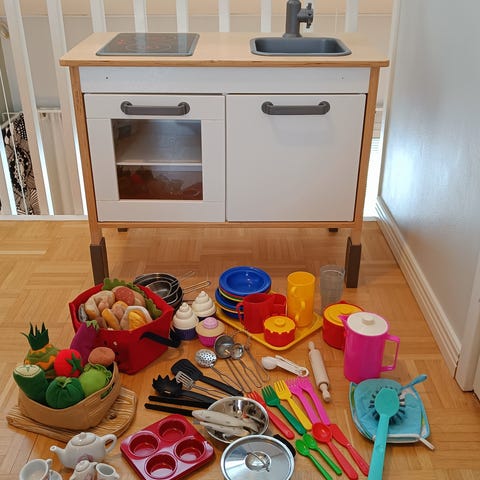 IKEA leikkikeittiö, käytetty, hyvä kunto. Hella ei toimi. Mukaan sekalainen setti muovisia astioita, ja ruokia, osa huonokuntoisia, jäätelösetti, kattila ym.
