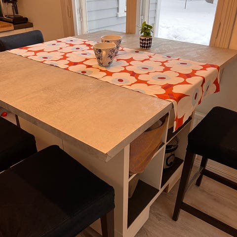 Topi keittiön laadukas saareke, jonka päällä Ikeassa teetetty pöytälevy. Mukanaan myös saarekkeen oma pöytälevy. Saarekkeessa kaksi vetolaatikkoa ja kaappi. Pakettiin kuuluu myös 4kpl Askon baarituolia.