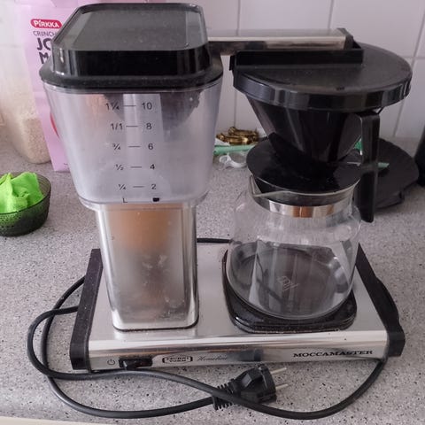 Myydään ehjä ja toimiva valkoinen moccamaster kahvinkeitin.keittimessä tupla lämmitys ja kalkinpoisto.