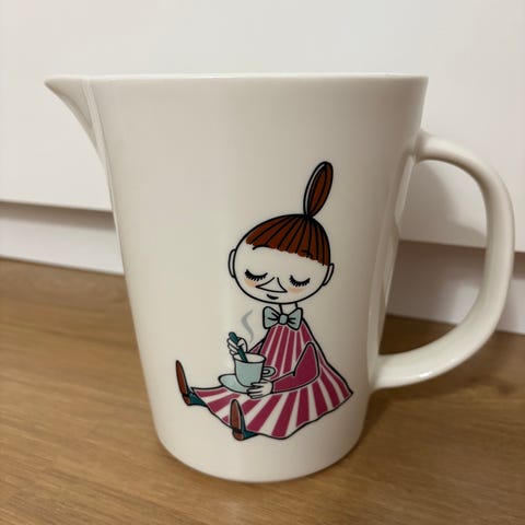Myynnissä tuotannosta poistunut Arabian muumikannu Juhlahetki. Sisäpuolella ei ole mitta-asteikkoa. Kannu on käyttämätön. Kannu on tilavuudeltaan 1,1 litraa. Toimitus postitse tai nouto Raisiosta.