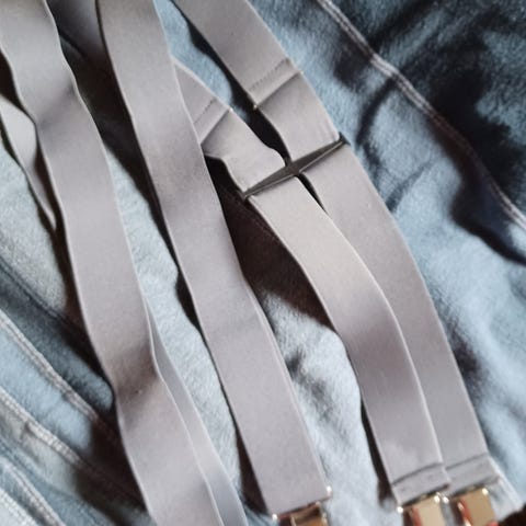 Miesten henkselit, joissa sininen pohjaväri ja koristeellinen kuviollinen nauha. Henkselit kiinnitetään housuihin metalliklipsuilla. Säädettävä pituus, selässä nahkajäljitelmäinen vahvikeosa. Sopivat käytettäväksi housujen tukena arki- ja juhlapukeutumisessa. Max pituus 115 cm. Hinta 4 euroa