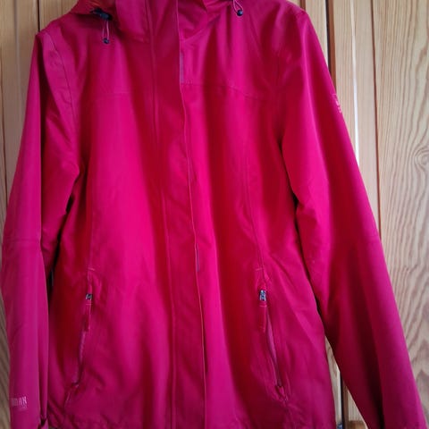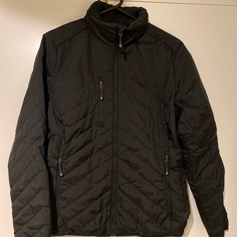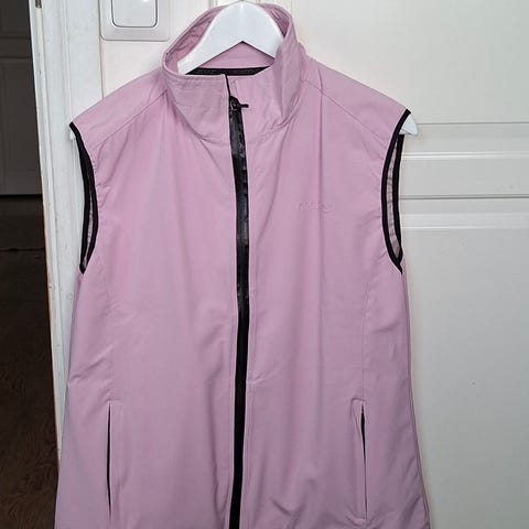 Valkoinen, jossa hento, harmaa geometrinen kuvio. Merkki Raiski. Taskujen vetoketjut limen vihreät. Vuoritettu. Sopii toisessa ilmoiruksessani olevan Acetour golf-liivin alle.