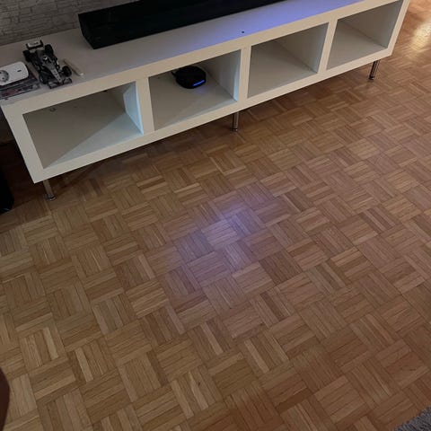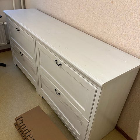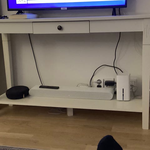 Iso ja tukeva tv-taso, jossa neljä laatikkoa. Pientä kulumaa havaittavissa. Pöytätaso on päällystetty mustalla huonekaluteipillä.