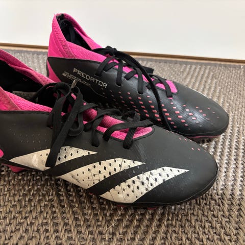 Adidas Predator jalkapallokengät nappulapohjalla. Kengissä on musta–oranssi väritys, oranssit nauhat ja valkoiset Adidas-raidat sivuilla. Päällinen on synteettistä materiaalia ja pohjassa on kiinteät nappulat nurmikentille. Sopivat jalkapallon pelaamiseen ulkokentillä. Yhdellä lapsella olleet käytössä hetken aikaa. Uutena ostettu. Koko 33