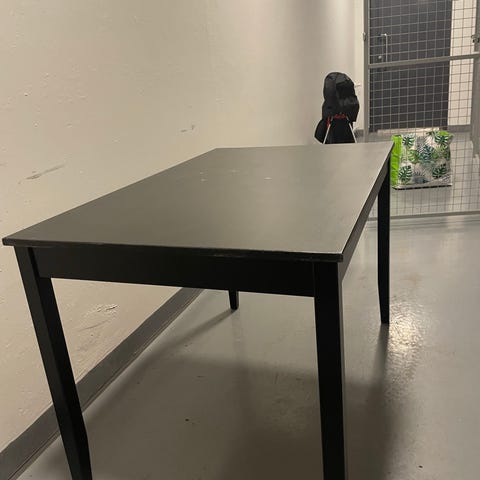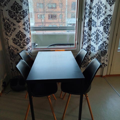 Musta ruokapöytä ja neljä tuolia