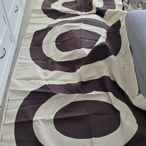 Marimekko Melooni kangas, pituus noin 600 cm. Värit musta ja beige, suuri graafinen Melooni-kuvio. Materiaalina puuvilla. Sopii esimerkiksi verhoihin, pöytäliinaksi, sisustustekstiileihin tai ompeluprojekteihin. Kangas myydään yhtenä pitkänä kappaleena. Nouto järvenpää tai 10.90 postit päälle.