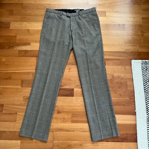 Miesten vähän käytetyt suorat housut. Kangas 55% polyesteriä ja 45 % villaa. Vyötärön ympärys on 90 cm ja lahkeen pituus on haara-lahkeensuu 73 cm.