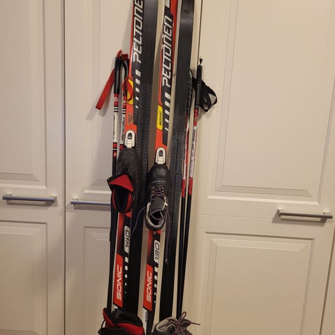 -Peltonen Tiger sukset 140cm. Kunto käytetty ja jälkiä on. Pohjat siistit ja siteet toimii.