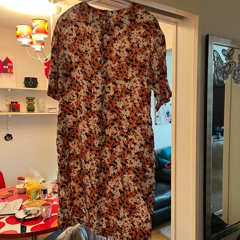 Siisti mekko.Väri sininen/musta/valkoinen.Mekossa on vuori,taskut ja vyönauha.Polvipituus,puolipitkät hihat.Ostin täältä ei tullut käyttöön.