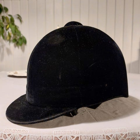 Ratsastuskypärä, koko 7/57. Väri musta. Kypärässä on samettipintainen ulkokuori, jossa helposti näkyy pienikin lika/osuma. Takana on useita ilmanvaihtoaukkoja. Kypärää ei ole käytetty moneen vuoteen ja on puhdistettu viime käyttökerran jälkeen.