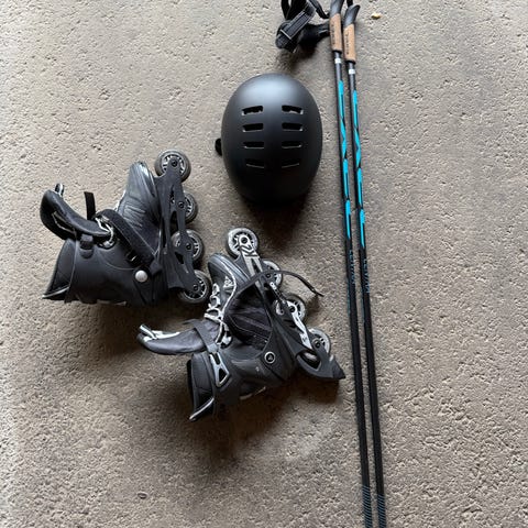 OK kuntoiset rullaluistimet, mukaan myös suojat ja setti uusia rullia.