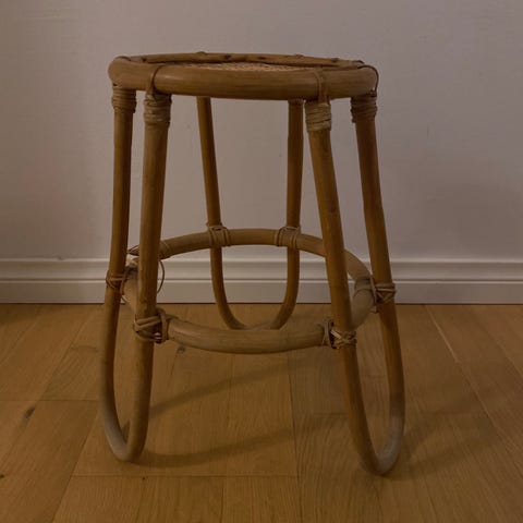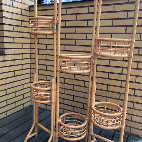 Myydään rottinkinen hylly, johon saa esimerkiksi ruukkukasvin.