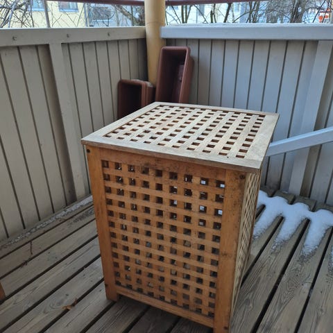 Parvekepöytä, terassipöytä tiikkiä, öljytty vuosittain. Taso (tarjotin osa) nostettavissa irti, jalat taitettavissa. Korkeus n 60cm, taso 40×60 cm.
