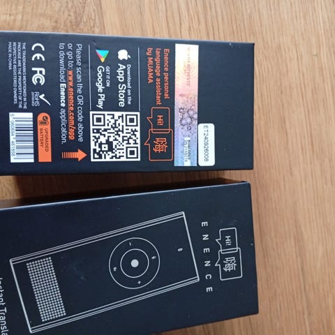 Muama Enence kielikäännöslaite. Taskukokoinen elektroninen kääntäjä, joka toimii yhdessä älypuhelinsovelluksen kanssa. Laitteessa on mikrofoni, kaiutin ja ohjauspainikkeet. Sopii puheen kääntämiseen eri kielten välillä, kun se on yhdistetty yhteensopivaan puhelimeen ja Enence-sovellukseen.