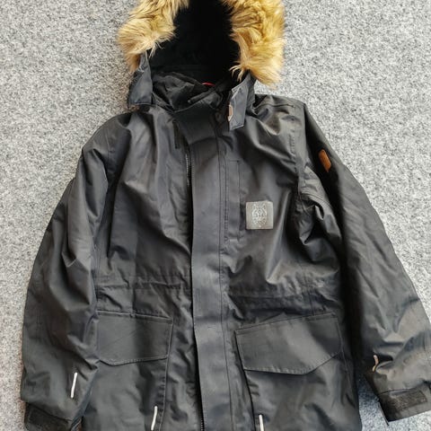 Reiman tummanharmaa talvitakki koossa 152. Hupussa karvareunus. Pientä kulumaa toisessa hihassa.