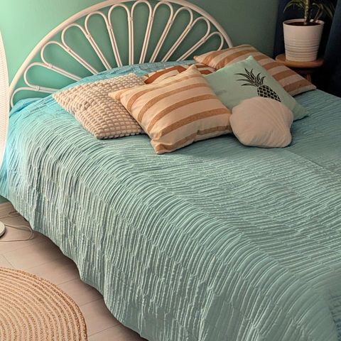 Kangas soveltuu myös esim.verhojen ompeluun. Kukkakuvio on kudottu kankaaseen. Kuvan sänky on 160 x 200 cm ja tämä on sopiva siihen. Sopii myös isompaan sänkyyn.