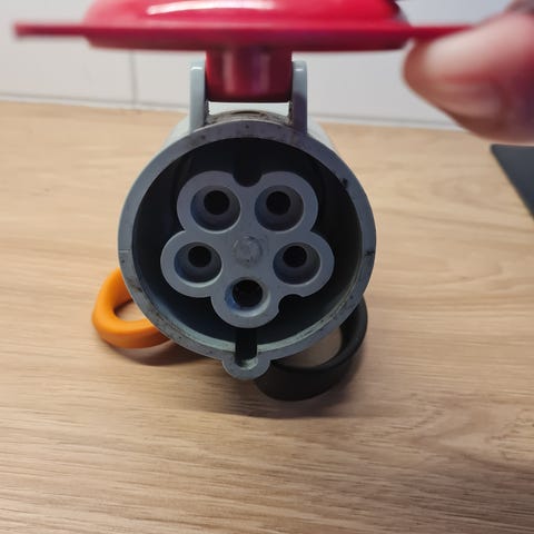 Viisinapainen, 3-vaiheinen, 32 A:n seinäpistorasia, katso esimerkiksi https://www.k-rauta.fi/tuote/pistorasia-opal-32a-5-napainen/6416013124826.