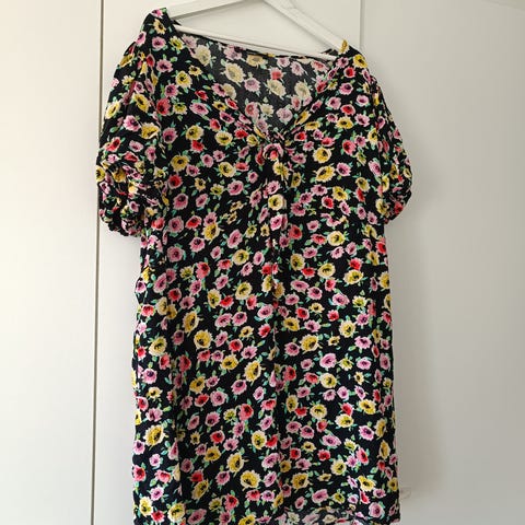 H&M kreikkalaistyylinen lyhyt mekko. Valkoinen pohja jossa sinisiä kuvioita. Resori vyötäröllä ja v-kaulus.