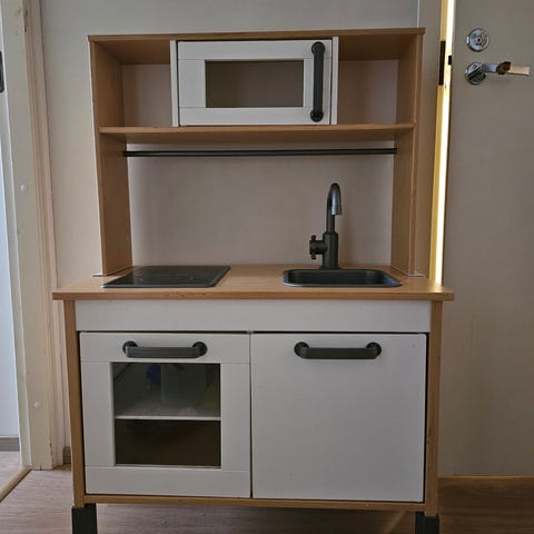 Ikean leikkikeittiö, joka maalattu harmaaksi. Tasot ja hyllyt harmaata dcfixiä. Pieniä kolhuja löytyy. Mukaan myös joitakin astioita.