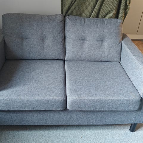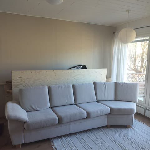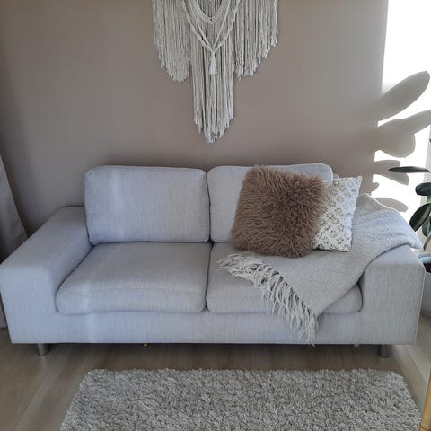 Vaalea/beige sohva. Hyvässä kunnossa. Selkänojan tyynyjen päälliset ja istuinten päälliset saa pois joten helppo pestä.