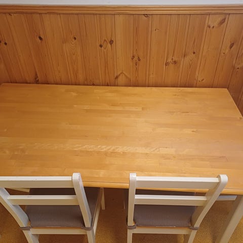 Ruokapöytä ja kaksi tuolia. Tuolit ostettu IKEAsta, ruokapöytä tilattu netistä.