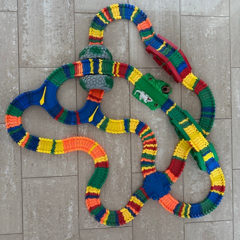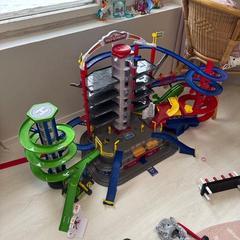 Top-Toys autorata ja parkkihalli samassa seuraavalla autofiilistelijälle. Korkein kohta 53 cm ja levein riippuen lisäradan sijoittelusta 86 cm. Hyvä leikitty kunto: yhdestä maalitolpasta yksi muoviosa katkennut, mutta pysyy vielä kiinni toisen muoviosan varassa, muutamasta vauhtilipusta tarrat hieman irronneet.