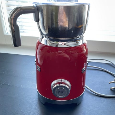 Smeg maitovaahdotin. Väri valkoinen, yläosa ja kannu ruostumatonta terästä. Sähkökäyttöinen laite maidon vaahdottamiseen ja lämmittämiseen esimerkiksi kahvijuomia varten. Laitteessa erillinen kannu ja virtajohto pöytämalliseen käyttöön.