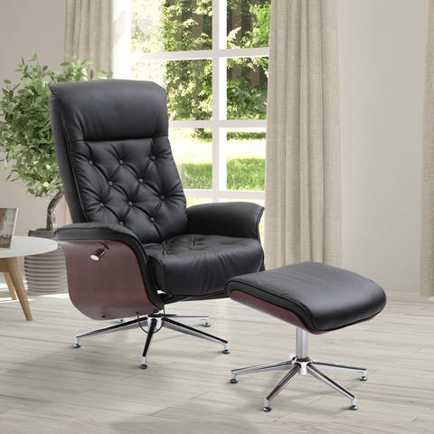 Rentoudu mukavasti. Korkea, kalteva selkänoja, jossa on pehmustettu niskatuki. Pehmeä keinonahka tyylikkään ilmeen takaamiseksi.. Säädettävä jopa 130°, jotta löydät ihanteellisen lepoasennon.. Yhdessä paksusti pehmustetun rahian kanssa nostaaksesi jalat ylös. Tuolin selkänoja voidaan kallistaa vapaasti jopa 130° mukavuuden takaamiseksi, ja sitä ohjataan helposti tavoitettavalla säätimellä.. Keinonahka on kestävää ja helppohoitoista, sopii vilkkaaseen liikenteeseen.. Paksut pehmusteet ja pehmustetut käsinojat takaavat optimaalisen mukavuuden.. Massiivipuupohja ja MDF-puu korkeaan kantavuuteen.. Tuoli voi kääntyä 360°, joten voit liikkua helposti.. Ruskea puinen pohja ja nahkamainen pinta syväompelein lisää modernia charmia.. Vaatii kokoamisen.. Tekniset tiedot:. Väri: Musta. Materiaali: keinonahka (100% polyesteri), vaahto, monikerroksinen levy, eukalyptuspuu. Kantavuus: 150kg (tuoli), 60kg (rahi)