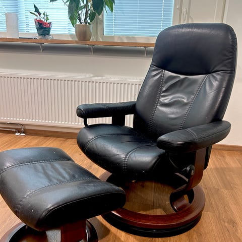 2-osainen setti: Tämän rentoutumistuolin mukana tulee mukava rahi, jolle voit laskea jalat ja rentoutua.. Säilytystilalla: Pehmustetun istuimen alla on piilotettu säilytyslokero aikakauslehdille, kirjoille tai kaukosäätimille.. Säädettävä selkänoja: Selkänojaa voidaan kallistaa jopa 145° ja sitä voidaan ohjata sivulla olevalla vivulla. Nojatuolia voidaan kääntää 360 astetta lisää joustavuutta.. Mukava: Ergonominen muoto ja pehmeä pehmuste takaavat mukavan istumakokemuksen.. Käsinoja ja rahi tekevät tästä nojatuolista erityisen mukavan.. Kokonaismitat: nojatuolin mitat istuma-asennossa L80 x S86 x K99cm, jakkaran mitat L47 x L42 x K45cm, maksimikantavuus: 120kg (nojatuoli), 100kg (jakkara).