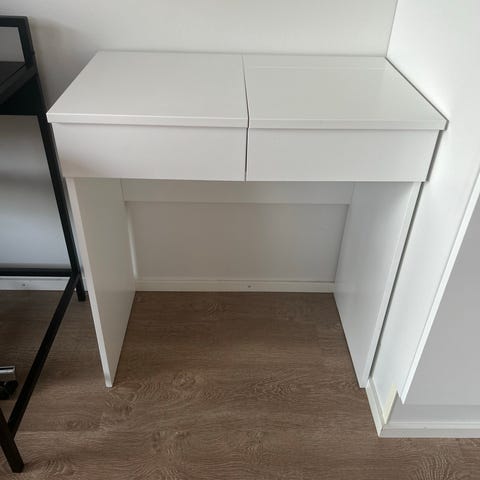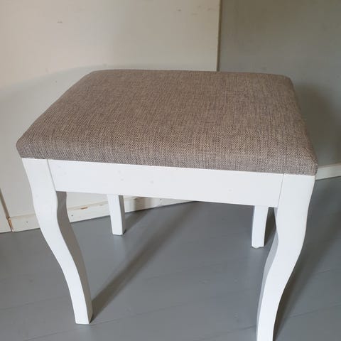 Pyörivä meikkituoli. Säädettävä korkeus. Valkoisessa pinnassa käytön jälkiä (väriläikkiä), mutta maalaamalla saa kuin uuden (näin itse tein n. 7 vuotta sitten). Kestävä ja pinta saattaa olla aitoa nahkaa. Ostettu alunperin kirpputorilta niin ei ole varmuutta. Vain nouto.