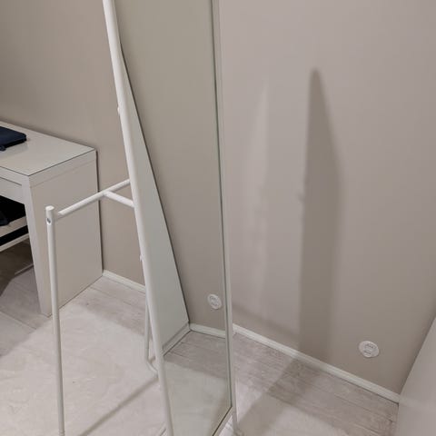 IKEA kokovartalopeili valkoisella kehyksellä. Peili on kapea ja korkea, soveltuu esimerkiksi makuuhuoneeseen tai eteiseen pukeutumispeiliksi. Taustapuolella on metallirunko, joka toimii jalustana ja pitää peilin pystyssä lattialla. Väri on valkoinen, materiaali metallirunko ja lasipeili.
