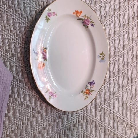 Arabia tarjoiluvati. Valkoinen posliinivati, jossa monivärinen kukkakuviointi reunoilla. Soikea muoto ja loivasti kohoavat reunat. Sopii esimerkiksi ruoan tai leivonnaisten tarjoiluun sekä kattauksen osaksi.