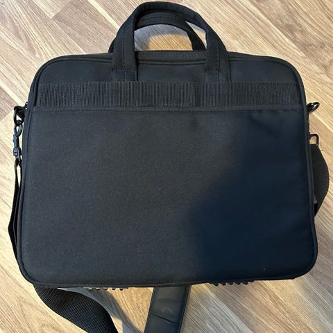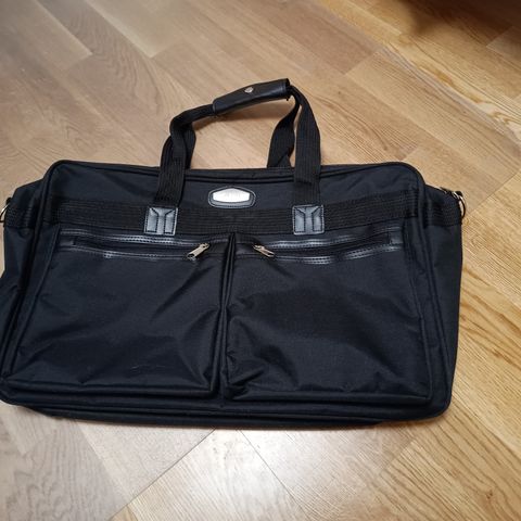 Musta kovakantinen laukku,kantohihna ja kantokahva.