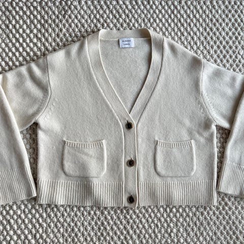 H&M Premiumin beige pitkä neuletakki. Neuletakissa vyö sekä taskut.