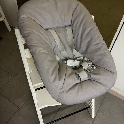 Stokke tripp trapp tuoliin sopiva vauvan sitteriosa. Pehmuste on harmaa ja siinä on säädettävät turvavaljaat. Mukana tulee valkoinen lelukaaren runko, johon voi kiinnittää leluja. Soveltuu vauvan käyttöön syöttötuolin päällä valmistajan ohjeiden mukaisesti.