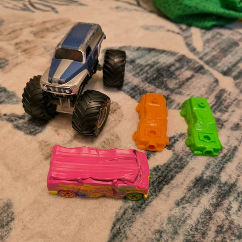 Sininen monsteriauto. Ehjä, pinnassa kulumaa. Noin 15 cm pitkä.