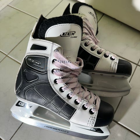 CCM Pro jääkiekkoluistimet, koko 38. Väri musta-valkoinen. Luistimet soveltuvat jääkiekkokäyttöön ja yleiseen luisteluun. Koko vastaa noin lasten/junioreiden kokoa 38. Terät ovat kiinteät ja kengän rakenne tukee nilkkaa jääkiekkoa pelattaessa sekä perusluistelussa.